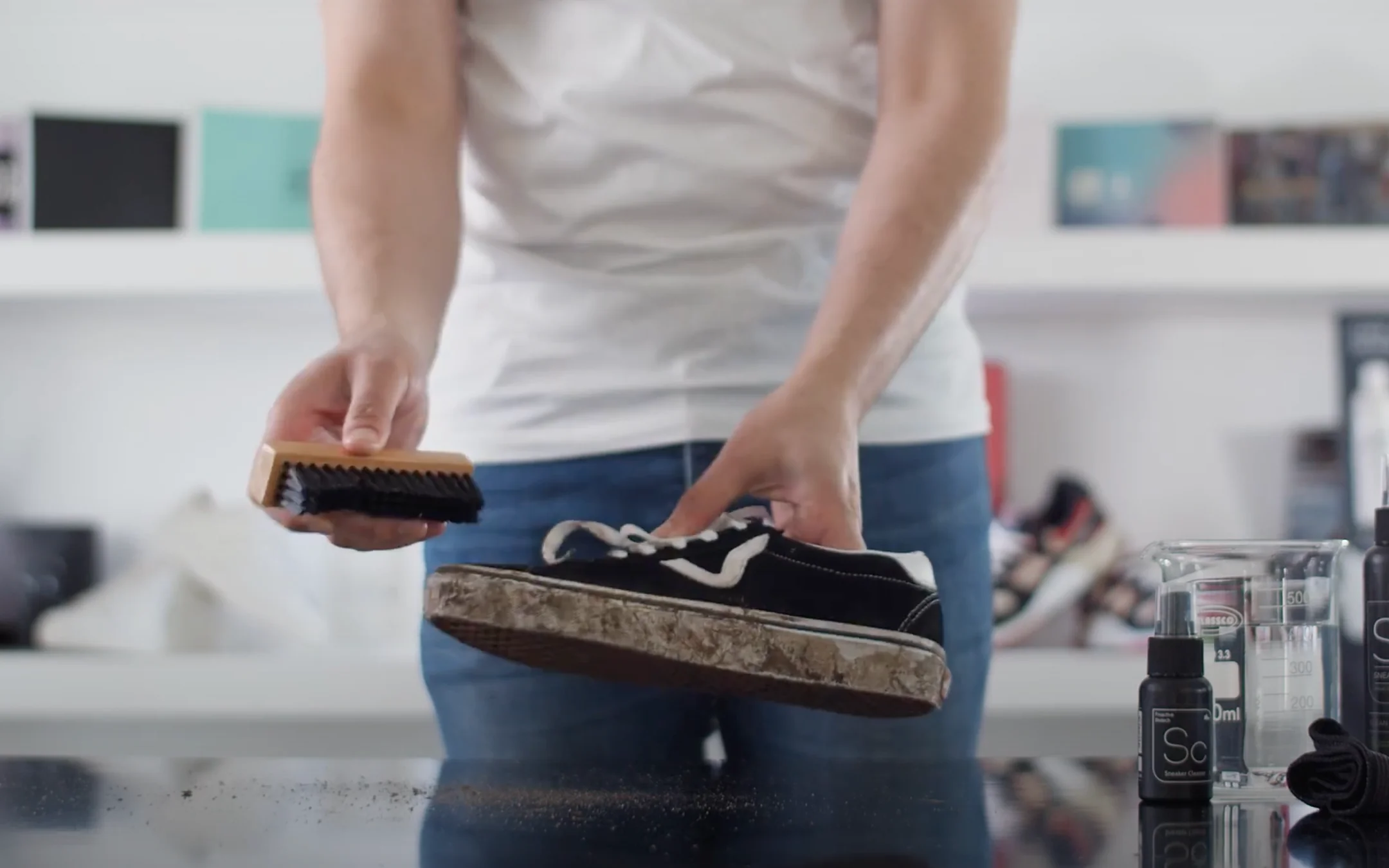 Krok 3: Następnie możesz spryskać trampki naszym środkiem do czyszczenia trampek; upewniając się, że nie przesycasz zamszu. Za pomocą naszej szczotki Premium szoruj w jednym kierunku, aby uniknąć uszkodzenia zamszu, a także pozwól, aby nasz środek do czyszczenia sneakersów wykonał swoją pracę.