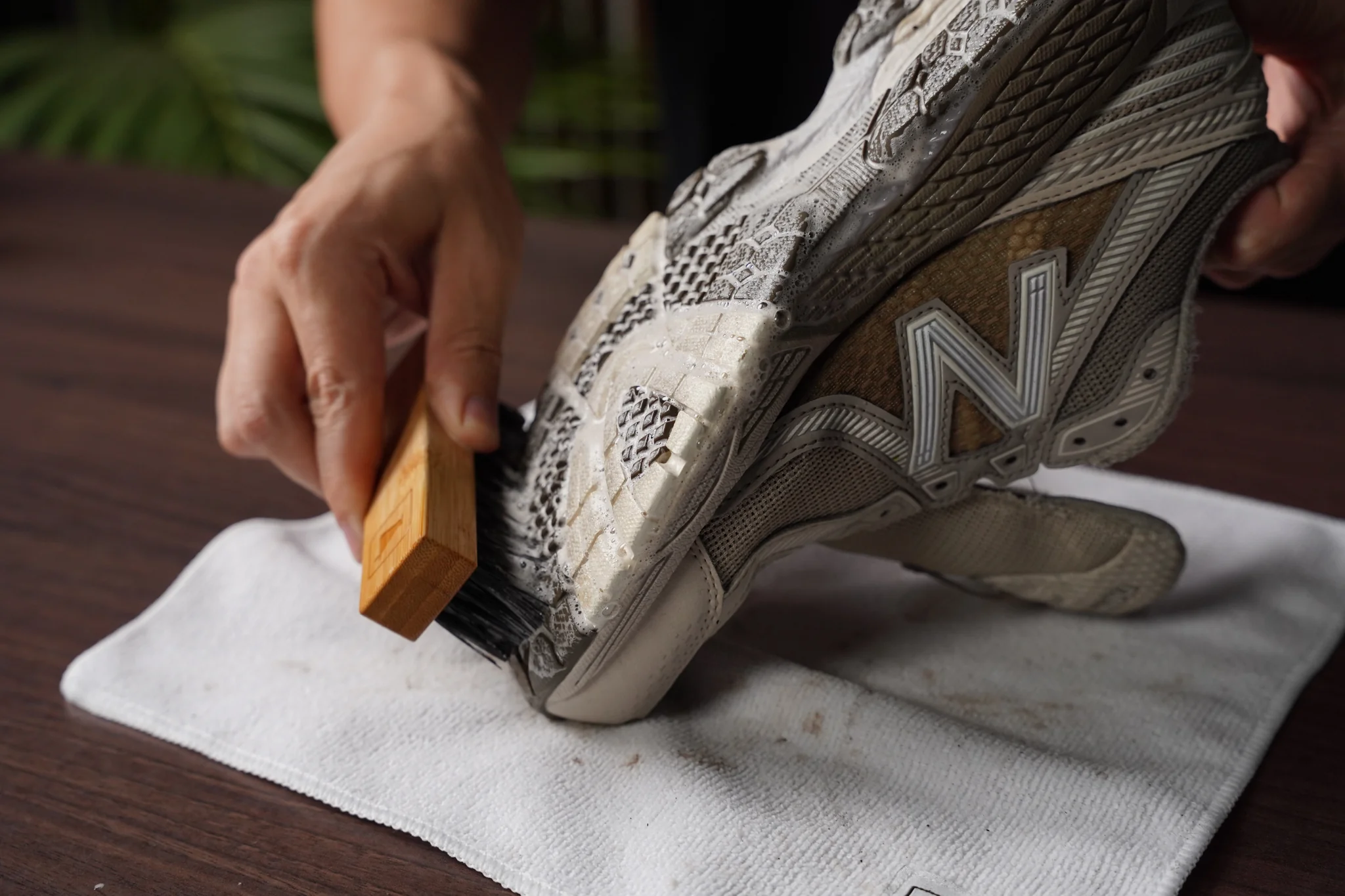 Krok 1: Najpierw należy przygotować buty do głębokiego czyszczenia. Zdejmij sznurowadła ze sneakersów i odłóż je na bok do późniejszego wyczyszczenia. Chwyć naszą szczotkę Premium i wyszczotkuj na sucho nadmiar brudu, skupiając się na mocno zabrudzonych miejscach.