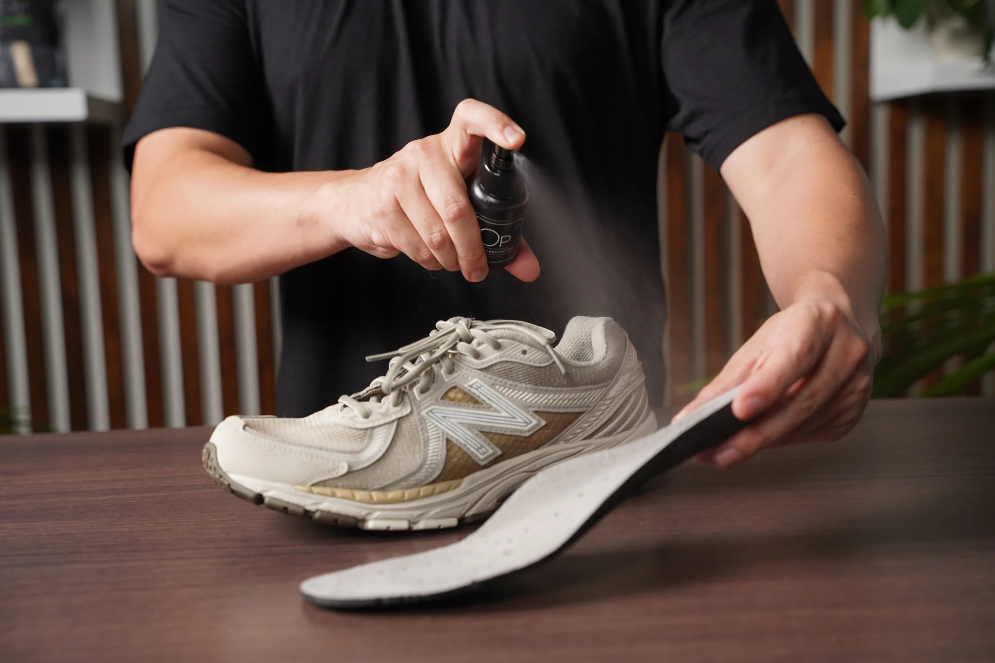 Krok 6: Następnie dodamy nasze spraye ochronne. Po pierwsze, użyj naszego Odor Protector w podeszwach butów, aby usunąć niepożądane zapachy i zapobiec gromadzeniu się bakterii. Jeśli podeszwy wewnętrzne są wyjmowane, wyjmij je i spryskaj wnętrze buta oraz podeszwy wewnętrzne.