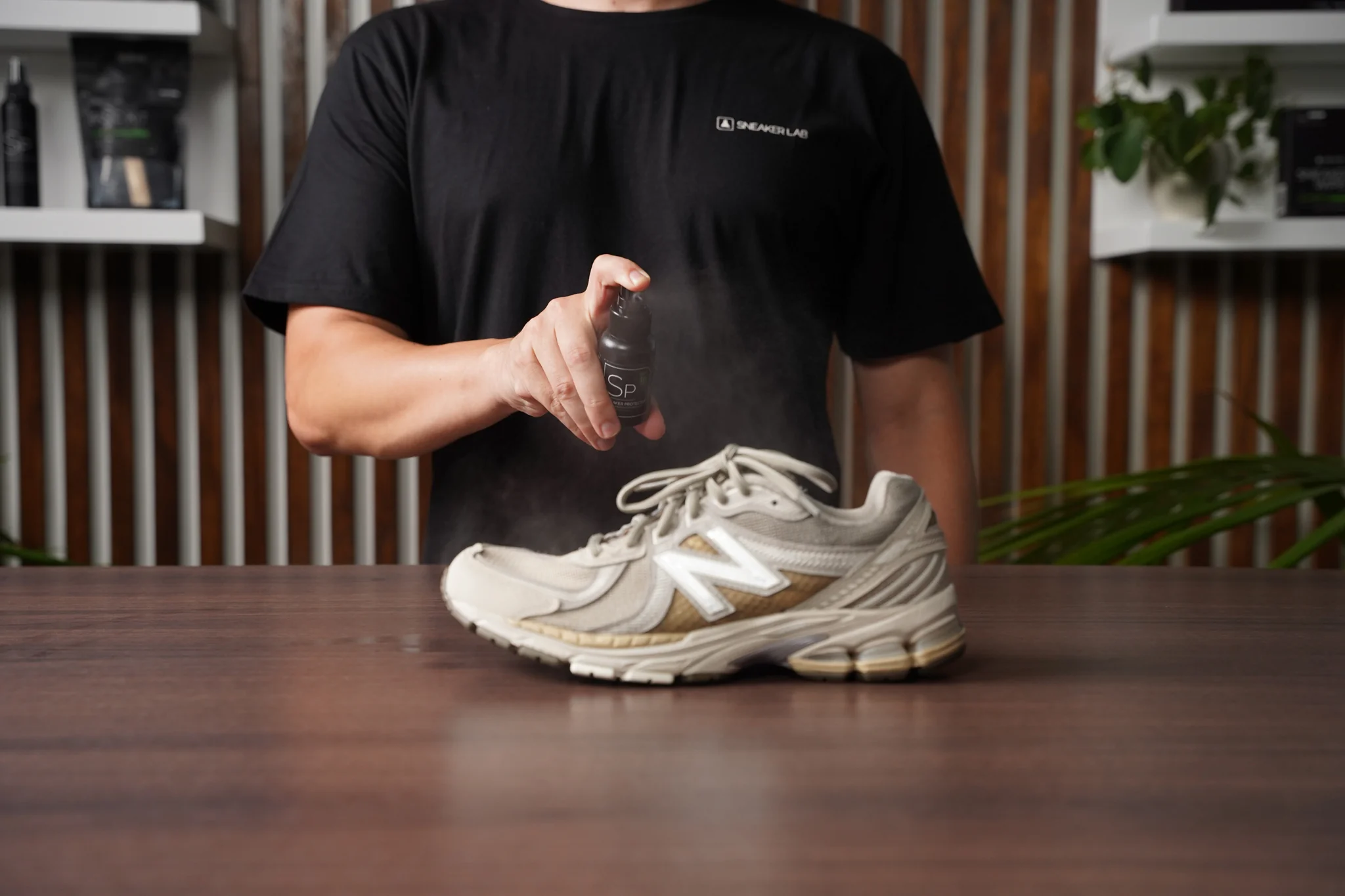 Krok 7: Na koniec rozpyl nasz Sneaker Protector wokół zewnętrznej części buta, aby zapobiec osadzaniu się brudu i bakterii, co z kolei ułatwi następne czyszczenie!