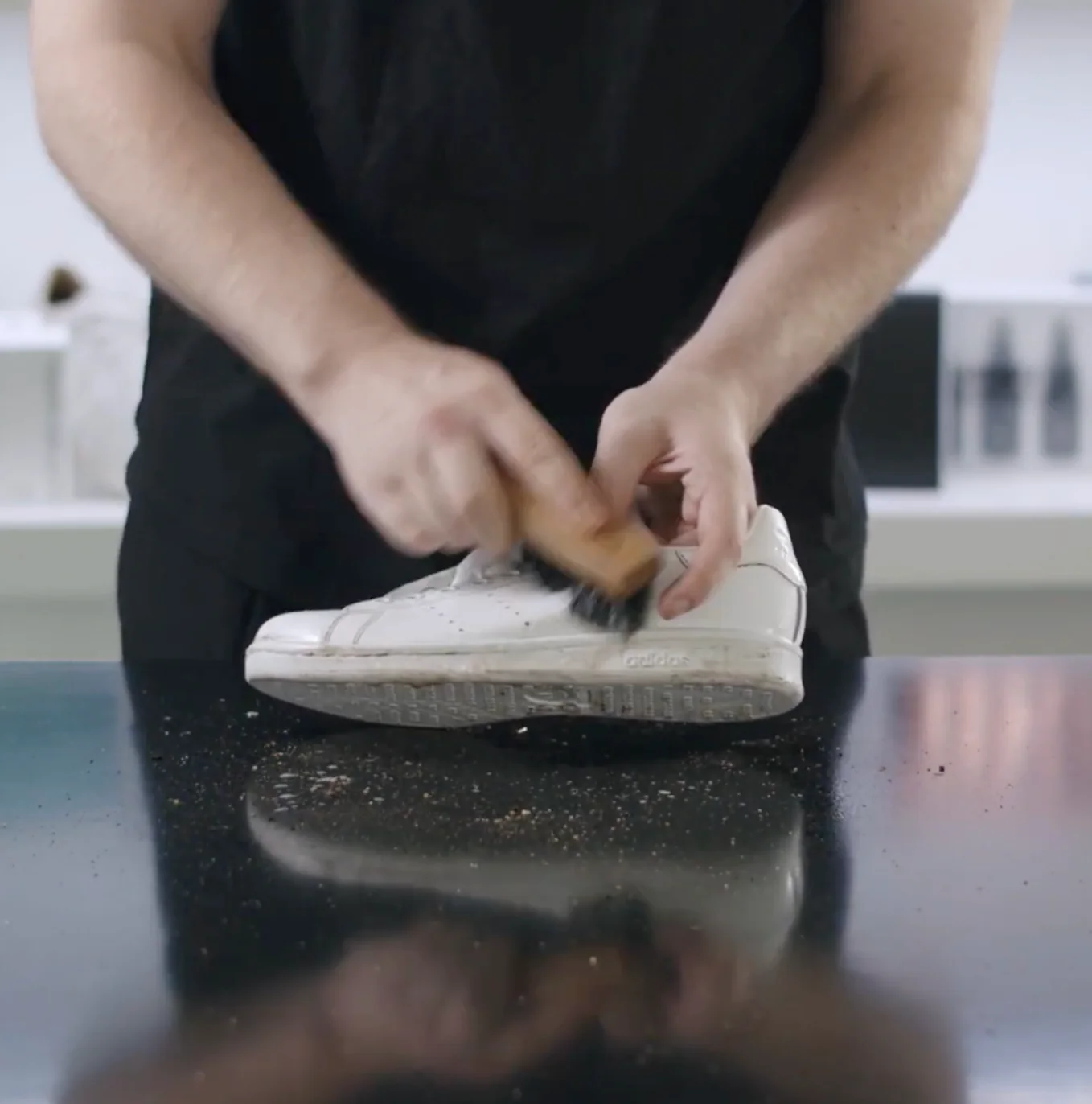 Zdejmij sznurowadła z trampek i użyj naszej szczotki Premium, aby usunąć luźny brud z trampek.
